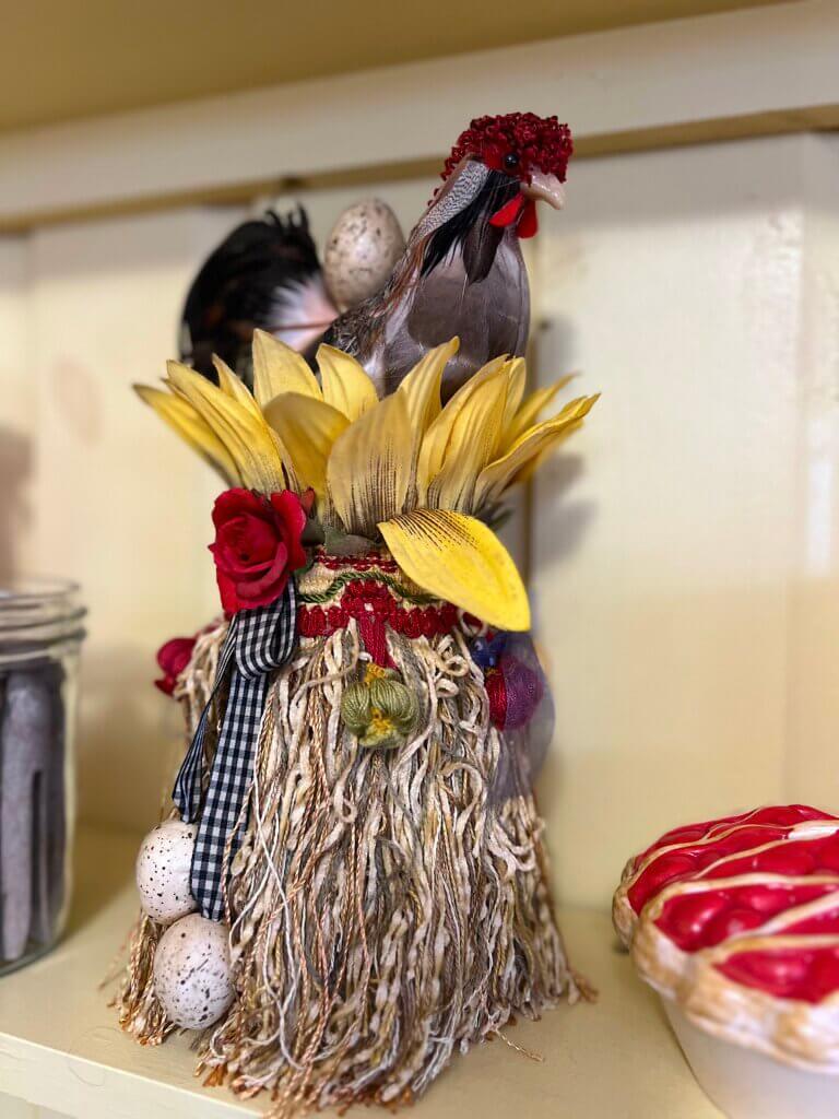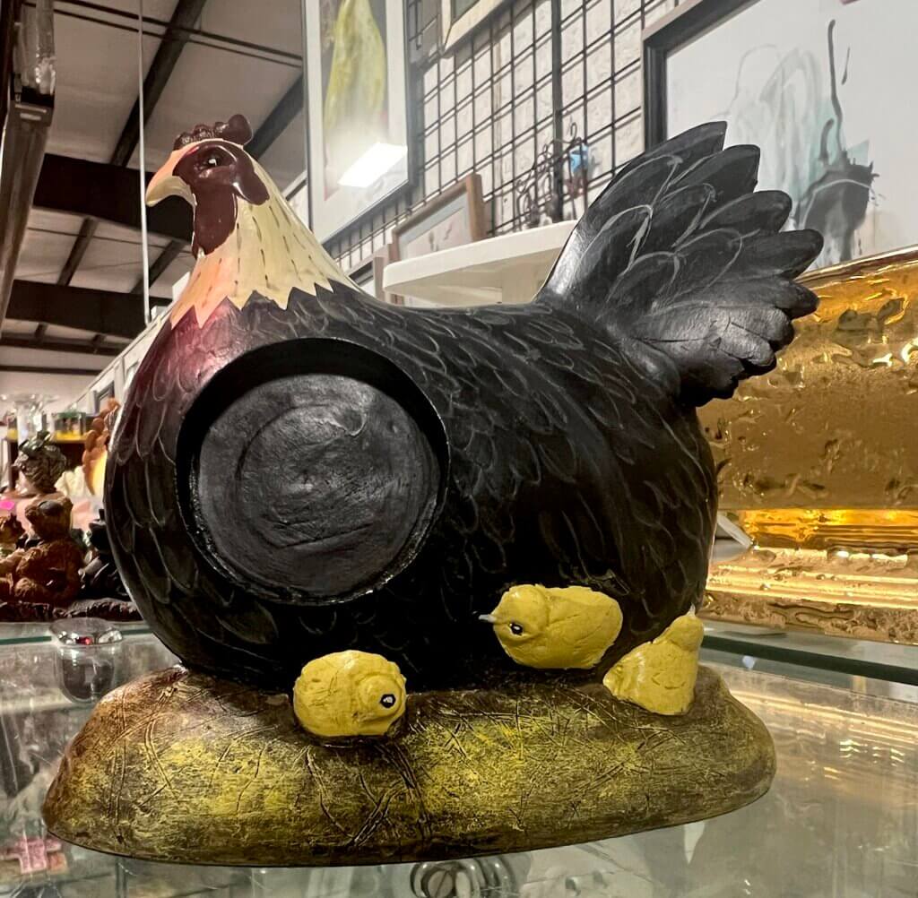 Collecting chickens can be a slippery slope. You can find chickens everywhere. They’re in antiques stores, thrift shops and grocery stores. You find them in art galleries and gift shops, and even at farmers’ markets and museums. The chickens that are available for purchase can be very tempting. You buy one or two chickens, and yes, they’re sweet. Family members start giving you chicken-items for birthdays and Christmas, and the chickens start to pile up in your home. You put up a couple more shelves, or replace your cute little accent cabinet with a much taller cupboard that has more space inside. Before you know it, you’re renting a storage unit on the edge of town, and then you have to move into it, because the chickens have completely taken over your home, and your kids aren’t talking to you any more, out of fear that they’ll inherit them all.