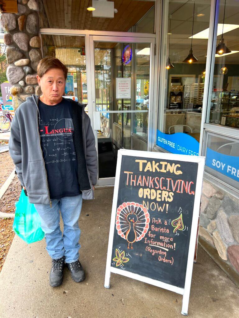 Poor Larry, outside Third Coast Bakery in Traverse City. We’ve never seen a chicken there.