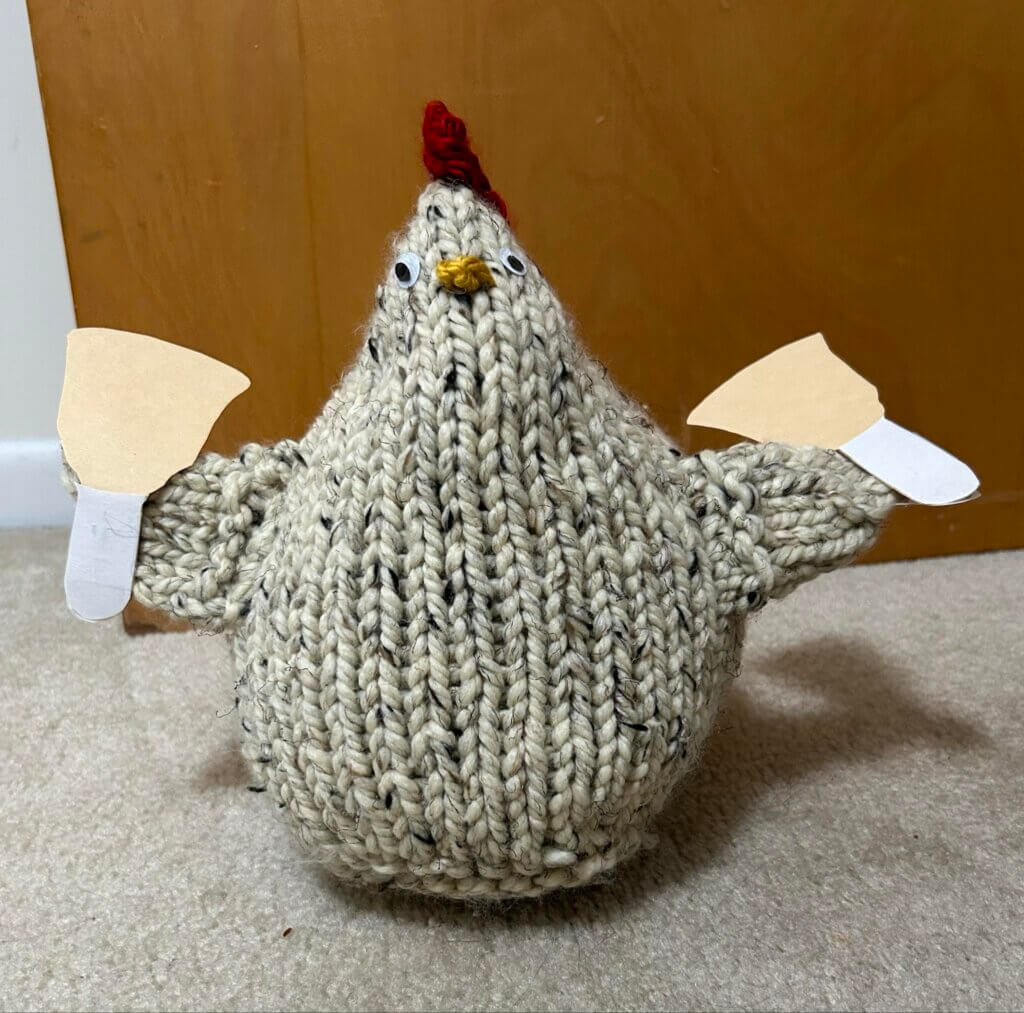 On Tuesdays, if there is a particularly special chicken, that chicken will get the Chicken of the Week award! There are no prizes if your chicken is chosen to be Chicken of the Week, but it’s exciting anyway! We have to admit that chickens chosen for this special award are often handmade, by people with knitting or crochet skills. Eileen’s chicken in the photo above was a recipient of the Chicken of the Week award, for example. Here is another: