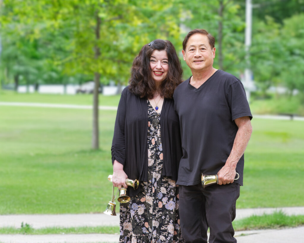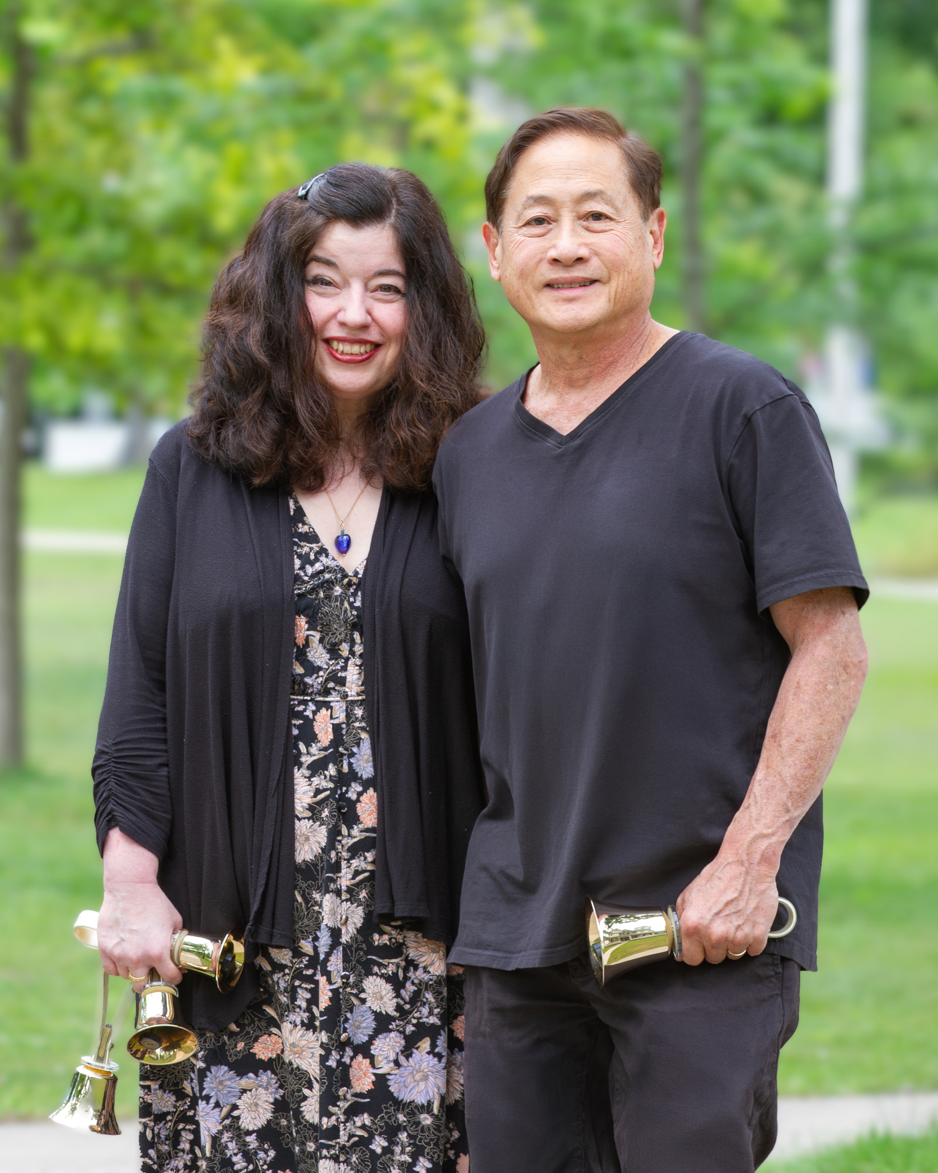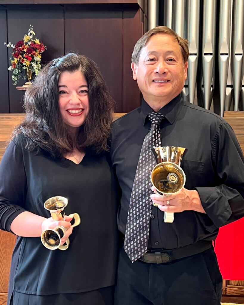Larry and Carla met online in 2008, on a website for handbell musicians. Carla moved to the USA in 2012, where they were married and started performing handbell duets together. Over the years, they’ve built up a wide repertoire of pieces arranged for just eight bells. They have performed together and taught in California, Washington, Oregon, Georgia, Pennsylvania, New York City, New Jersey, Nebraska, Connecticut, Wisconsin, Ohio, and Michigan. They arrange all their own handbell duets, and they aim to demonstrate that handbell performances are not only beautiful to listen to, but can also be graceful and interesting to watch.